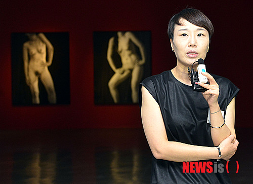 【과천=뉴시스】최동준 기자 = 4일 오전 경기 과천시 국립현대미술관에서 열린 '올해의 작가상 2014' 미디어간담회에서 후보 작가로 선발된 장지아 작가가 작업 설명을 하고 있다.