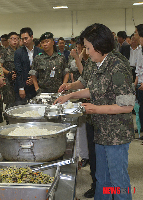 【논산=뉴시스】전진환 기자 = 6일 오후 새정치민주연합 박영선 국민공감혁신위원장이 충남 논산시 육군훈련소를 찾아 28연대 2교육대 훈련병들과 식사를 하고 있다. 2014.08.06.