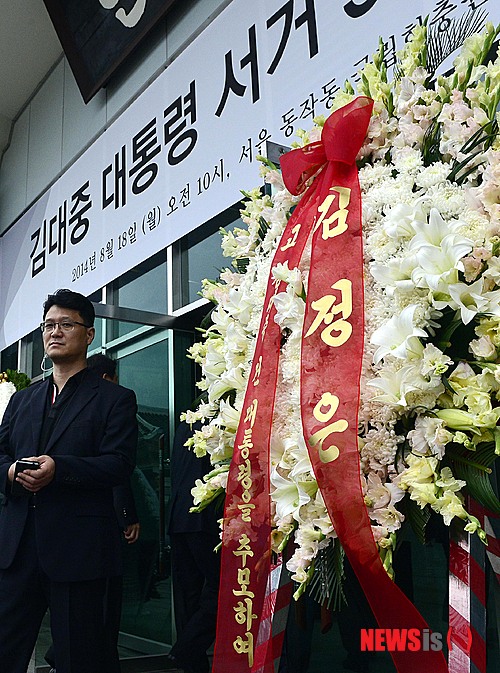 【서울=뉴시스】최동준 기자 = 18일 오전 서울 동작구 국립서울현충원에서 열린 김대중 전 대통령 서거 5주기 추도식 식장 입구에 북한 김정은 국방위원회 제1위원장이 보낸 조화가 놓여있다. 2014.08.18.