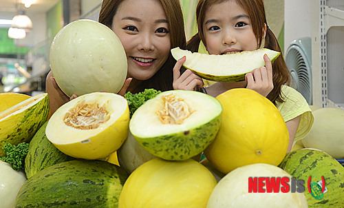 롯데마트의 3색 메론은 미국 캘리포니아의 비옥한 토지와 강렬한 태양 아래 재배돼 당도가 뛰어난 것이 특징이며 가격은 통당 4900~6900원이다.   2014.08.24