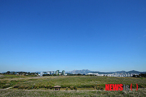 【서울=뉴시스】박문호 기자 = 완연한 가을날씨를 보이는 18일 오후 서울 마포구 하늘공원에서 바라본 하늘이 구름 한 점 없이 푸르다.