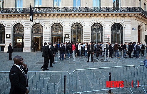 【파리(프랑스)=뉴시스】김진아 기자 = 19일 오전(현지시각) 프랑스 파리 애플 스토어 오페라점 앞에서 사람들이 아이폰6와 아이폰6플러스를 구매하기 위해 줄을 서고 있다. 2014.09.19. (사진=프리랜서 이준성)