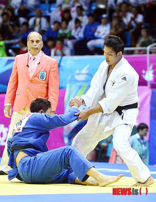 【인천=뉴시스】최동준 기자 = 21일 인천 도원체육관에서 열린 '2014 인천 아시안게임' 남자 유도 81kg급 준준결승전에서 누르기 한판승으로 승리한 대한민국 김재범이 북한의 박홍위를 일으켜 세워주고 있다. 2014.09.21.