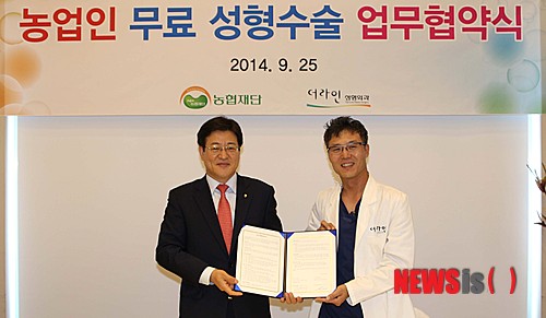 【서울=뉴시스】25일 서울 강남구 더라인 성형외과병원에서 이재식(왼쪽) 농협재단 사무총장과 조재호 더라인성형외과 원장이 농업인 무료성형 업무협약을 체결하고 기념촬영을 하고 있다. 2014.09.25. (사진=농협재단 제공)