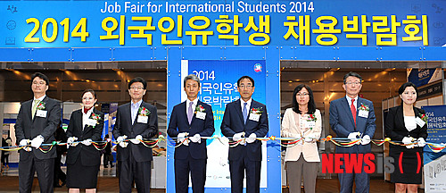 【서울=뉴시스】조성봉 기자 = 1일 서울 강남구 코엑스에서 열린 ‘2014 외국인 유학생 채용박람회’에서 김병권(왼쪽 네 번째) KOTRA 전략사업본부장을 비롯한 참석자들이 테이프 커팅을 하고 잇다.