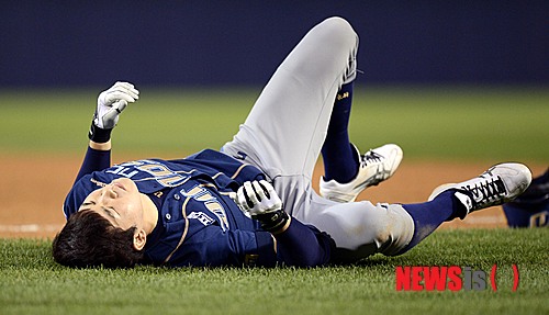 【서울=뉴시스】김인철 기자 = 6일 서울 잠실야구장에서 열린 2014 한국야쿠르트 세븐 프로야구 LG 트윈스와 NC 다이노스의 경기에서 9회초 2사 NC 박민우가 포수 실책으로 출루하다 박경수와 충돌하자 고통스러워 하고 있다. 2014.10.06.