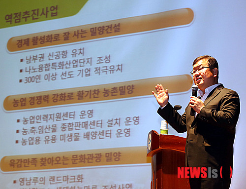 【밀양=뉴시스】안지율 기자 = 박일호 경남 밀양시장은 8일 청소년 수련관에서 대한노인회 밀양시지회 부설 노인대학 수강생 100여 명이 참석한 가운데 민선6기 시정에 임하는 자세와 각오, 노인복지사업과 현안사업 등을 설명하는 특강을 하고 있다. 2014.10.09. (사진=밀양시 제공)