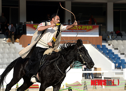 【과천=뉴시스】박상훈 기자 = 10일 오후 과천 렛츠런파크 서울 야외승마장에서 한국마사회와 농림축산식품부가 후원하는 '제10회 세계기사선수권대회'가 열린 가운데 선수들이 말을 달리며 과녁을 향해 활을 쏘는 ‘기사’(騎射) 종목에 참가하고 있다. 2014.10.10.