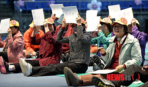 【서울=뉴시스】고범준 기자 = 20일 오후 서울 송파구 서울놀이마당에서 꽃보다 청춘! 뉴 에이징(New Aging)이라는 주제로 열린 '제16회 송파 노인문화제'에서 어르신들이 지덕체를 뽑아라 게임에 앞서 본인 이름을 적고 있다. 2014.10.20.