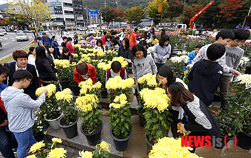 【전주=뉴시스】유영수 기자 = 어려운 이웃도 돕고 국화향기도 즐기는 전주시 서서학동 1만1000송이 국화전시회가 전북 전주시 완산구 서학광장에서 21일부터 24일까지 4일간 열린다. 사진은 국화 전시가 열리고 있는 서학광장을 찾은 시민들과 학생들이 활짝 핀 국화를 바라보며 깊어가는 가을을 만끽하고 있다.2014.10.21.