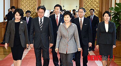 【서울=뉴시스】홍찬선 기자 = 박근혜 대통령이 31일 오후 청와대에서 열린 신임 대사 신임장 수여식에 참석해 윤병세 외교부장관과 임근형 주헝가리대사, 최종현 주네덜란드대사와 함께 환담장으로 이동하고 있다. 2014.10.31.
