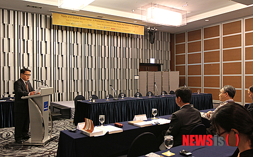 【서울=뉴시스】6일 서울 강남 노보텔 호텔에서 FTA와 WTO의 연계적 관점에서의 국제통상체제를 주제로 열린 한국법제연구원-한국국제경제법학회 공동 국제학술대회에서 김대원 한국국제경제법학회장이 개회사를 하고 있다. 2014.11.06. (사진=한국법제연구원 제공)