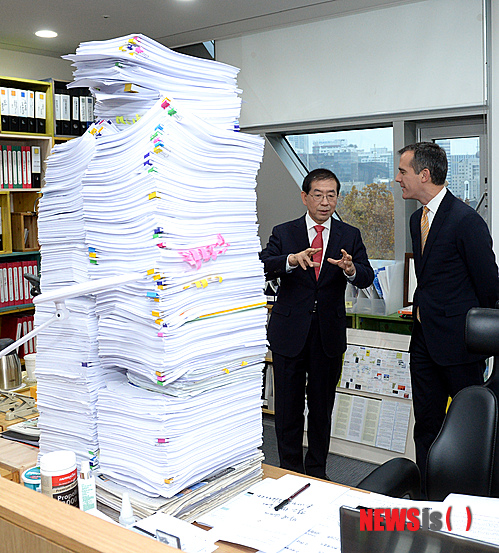 【서울=뉴시스】박상훈 기자 = 박원순 서울시장이 24일 오전 중구 서울시청 시장 집무실에서 에릭 가세티(Eric Garcetti) 미국 LA 시장을 만나 우호협력 강화 협의서를 체결하기 전 이야기를 나누고 있다. 2014.11.24.