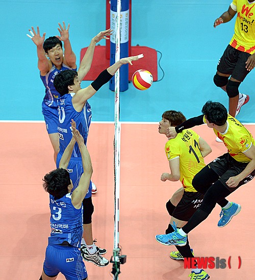 【안산=뉴시스】박영태 기자 = 10일 오후 경기도 안산시 상록수체육관에서 열린 ‘2014-2015 NH농협 V-LEAGUE’ OK저축은행과 대한항공의 경기에서 OK 저축은행 송희채의 스파이크를 대한항공 이영택이 막아내고 있다. 2014.12.10.