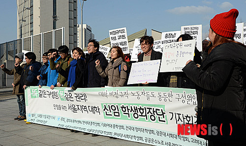 【서울=뉴시스】조수정 기자 = 11일 오전 서울지역 대학 신임 학생회장단이 서울 이화여자대학교 정문 앞에서 기자회견을 열고 대학 비정규직 노동자들의 차별 반대를 촉구하고 있다.