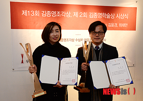 【서울=뉴시스】조수정 기자 = 12일 오후 서울 평창동 김종영미술관에서 열린 '제13회 김종영조각상 및 제2회 김종영 학술상' 시상식에서 조각상 수상자인 조각가 김윤경 씨(왼쪽)와 학술상 수상자인 최태만 국민대 미술학부 교수가 상장과 트로피를 들어보이고 있다.