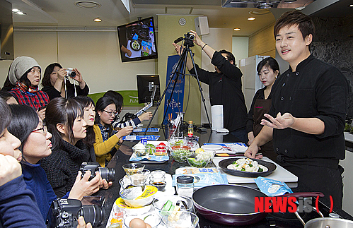 【서울=뉴시스】19일 서울 강남구 수서동 풀무원 풀스키친에서 열린 '특급 엄마의 특급 레시피' 쿠킹클래스에 참석한 신효섭 셰프가 '브로컬리 직화어묵 샐러드' 요리를 시연하고 있다. 2014.12.19. (사진=풀무원 제공)