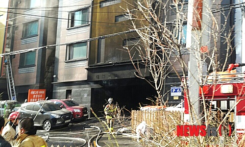 【의정부=뉴시스】이종구 기자 = 10일 오전 9시26분께 경기 의정부시 의정부동의 한 아파트 지상 1층 주차장 필로티에서 원인을 알 수 없는 불이 났다. 이 불로 한모(26·여)씨 등 2명이 숨지고 96명이 연기를 마시는 등 다쳐 인근 병원으로 이송됐다. 2015.01.10.