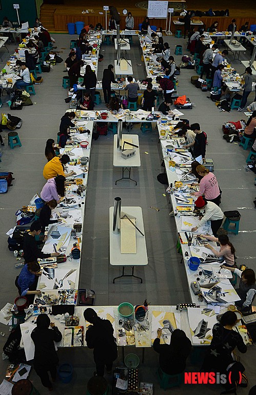 【서울=뉴시스】고승민 기자 = 15일 오후 서울 건국대학교 사범대학 부속고등학교 실내체육관에서 열린 2015학년도 의상디자인학과 기초디자인 실기고사에서 수험생들이 정성들여 그림을 그리고 있다. 2015.01.15.