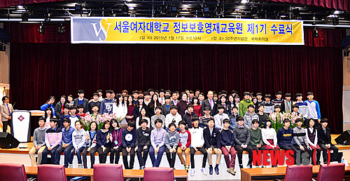 【서울=뉴시스】박동욱 기자 = 17일 오전 노원구 화랑로 서울여자대학교에서 열린 정보보호영재교육원 1기 수료식에서 황우여 사회부총리 겸 교육부 장관, 전혜정 서울여대 총장 등 내빈들과 수료생들이 기념촬영을 하고 있다. 2015.01.17.