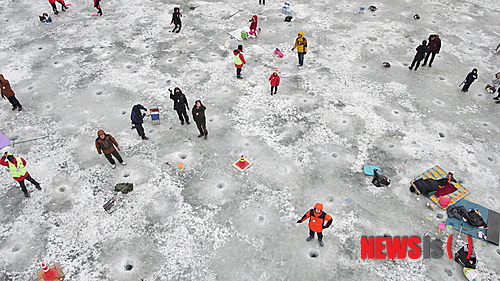 【화천=뉴시스】전형준 기자 = 휴일을 맞은 18일 '2015 산천어축제'가 강원 화천군 화천천 일원에서 열리고 있는 가운데 수많은 인파가 몰리며 대성황을 이루고 있다. 사진은 상공에서 바라본 산천어축제장 전경. 2015.01.18.