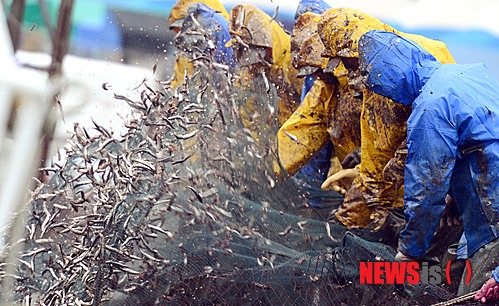 【부산=뉴시스】 하경민 기자= 22일 오후 부산 기장군 대변항에서 어부들이 갓 잡아 올린 멸치를 그물에서 털어내고 있다.