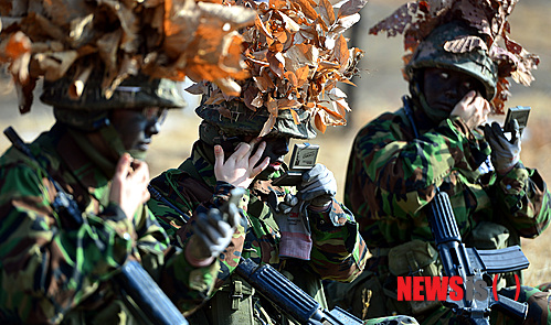 【영천=뉴시스】강진형 기자 = 23일 오전 경북 영천시 고경면 육군3사관학교에서 육군3사관학교 52기 여생도들이 각개전투 훈련에 앞서 위장을 하고 있다. 2015.01.23.