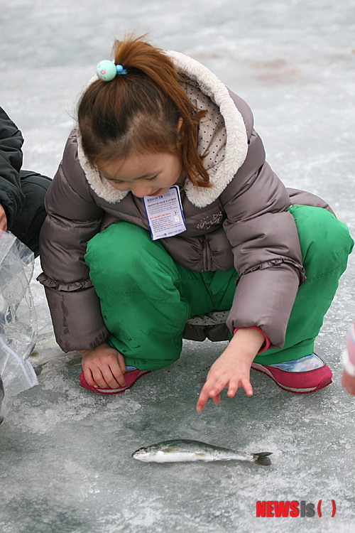 【화천=뉴시스】박혜미 기자 = 25일 강원 화천군 화천천 일대에서 '2015 얼음나라 화천 산천어축제'가 열리고 있는 가운데 얼음낚시터에서 한 어린이 방문객이 낚은 산천어를 조심스럽게 잡으려 하고 있다. 2015.01.25.