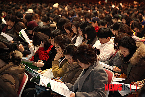 【서울=뉴시스】29일 오후 서울 강남구 도곡동 숙명여고 대강당에서 열린 '종로학원하늘교육 2016학년도 대입 성공전략 설명회'를 찾은 학부모 및 수험생들이 자료를 보고 있다. 2015.01.29. (사진=종로학원하늘교육 제공)