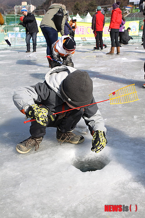 【화천=뉴시스】한윤식 기자 = 강원 화천군 화천천 일대에서 열리는 산천어축제가 연일 성황을 이루고 있는 가운데 31일 부모와 함께 축제장을 찾은 외국인 어린이가 얼음낚시를 즐기고 있다.2015.01.31.