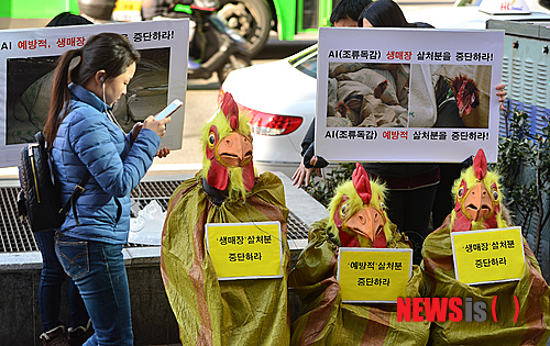 【서울=뉴시스】강진형 기자 = 1일 오후 서울 마포구 지하철 홍대입구역 앞에서 한국동물보호연합 관계자들이 AI 예방적 살처분 및 생매장 중단 촉구 캠페인을 펼치고 있다. 2015.02.01.