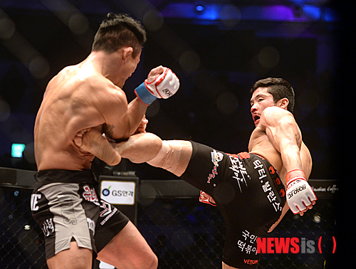 【서울=뉴시스】박상훈 기자 = 1일 오후 서울 중구 장충체육관에서 열린 '굽네치킨 로드FC 021' 페더급 타이틀매치에서 최무겸(오른쪽)이 서두원에게 미들킥을 하고 있다. 015.02.01.