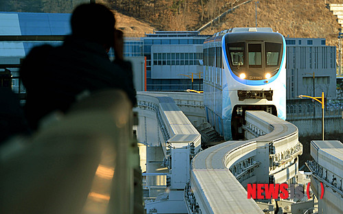 【대구=뉴시스】박문호 기자 = 대구도시철도공사 도시철도 3호선 모노레일 영업 시운전이 시작된 9일 오전 대구 칠곡경대병원역으로 열차가 들어오고 있다.
