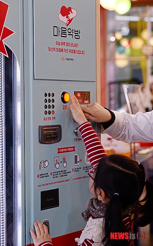 【서울=뉴시스】김인철 기자 = 13일 오후 서울시청 시민청 활짝라운지에서 한 어린이가 서울문화재단 주관으로 설치된 '마음약방' 자판기를 이용하고 있다.