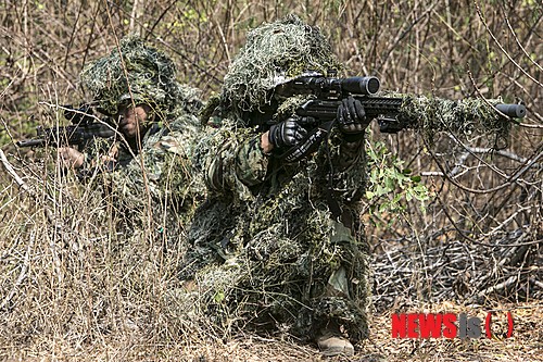【서울=뉴시스】김진아 기자 = 2015 코브라골드 연합훈련에 참가 중인 한국 해병대 수색중대 저격수가 정글위장을 하고 가상의 목표지역으로 은밀히 기동하고 있다.