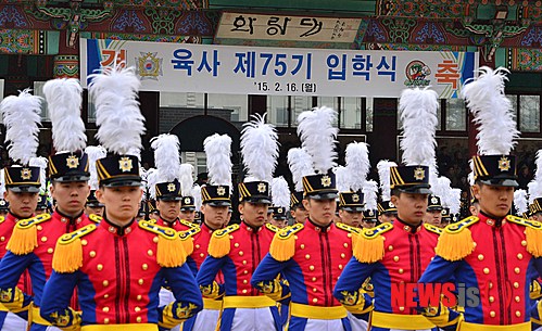 【서울=뉴시스】고승민 기자 = 16일 오전 서울 노원구 육군사관학교 화랑연병장에서 열린 육사 75기 입학식 및 진학식에서 신입 생도가 기념 영상을 시청하고 있다. 2015.02.16.