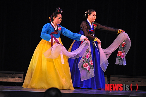 【뉴욕=뉴시스】노창현 특파원 = 22일 뉴저지 잉글우드의 버겐퍼포밍아트센터(버겐팩)에서 열린 한국전통가무악이 화려하게 펼쳐졌다. 한국전통예술단가무악과 문화재청이 주최하고 한국전통예술원(원장 정혜선)과 한국공연예술센터(대표 박수연)가 주관한 이번 공연은 중요 무형문화재 제19호 보유자인 황용주의 산타령을 비롯, 제27호 승무 및 97호 살풀이 이수자인 박소림, 제57호 이수자 신재희 등 9명이 꾸미는 경기민요 접속곡, 오미자의 살풀이춤과 입춤, 안춘자와 환희무용단의 군무 ‘남도살풀이’와 장고춤, 태평무, 관현악 합주 ‘천년만세’, 아쟁산조 등 다양한 전통춤과 연주가 이어졌다. 사진은 환희무용단의 남도살풀이. 2015.02.23. <사진=Newsroh.com 제공>