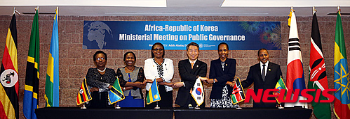 【서울=뉴시스】정종섭 행정자치부 장관이 18일(현지시각) 에티오피아 아디스 아바바에서 아프리카 지역에 행정한류를 전파하기 위한 '한-아프리카(1+5) 행정장관회의'를 주최, 공공행정 분야 실질 협력 확대를 위한 공동선언문을 발표한 뒤 기념촬영을 하고 있다.