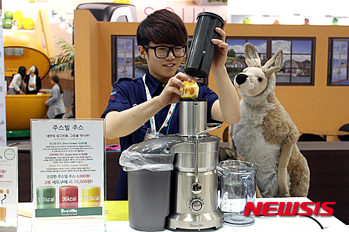 【서울=뉴시스】호주 No.1 가전 브랜드 브레빌(Breville)이 9일 서울 삼성동 코엑스에서 열린 2015 서울커피엑스포에 참가해 스피드 주서로 리부팅 주스 시연 행사를 진행하고 있다. 2015.04.09. (사진=브레빌 제공)