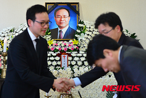【서산=뉴시스】김기태 기자 = 10일 오후 충남 서산의료원 장례식장에 마련된 故 성완종 전 경남기업 회장의 빈소에서 성 회장의 장남 성승훈씨가 조문객을 맞고 있다. 2015.04.10.