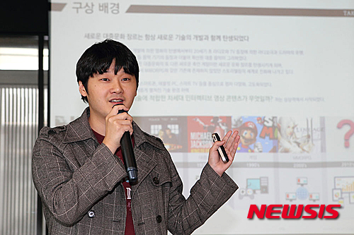 【서울=뉴시스】10일 경기도 성남시 판교에 위치한 경기창조경제혁신센터에서 열린 'KT 경기창조경제혁신센터 기자단 투어'에서 쇼베 정민채 대표가 영화의 스토리텔링과 결합된 양방형 게임 서비스에 대해 설명하고 있다. 2015.04.12. (사진=KT 제공)