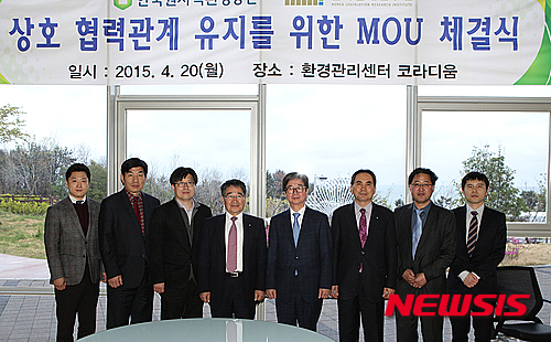 【서울=뉴시스】이원 한국법제연구원장과 이종인 한국원자력공단 이사장이 20일 경북 경주시 한국원자력환경공단에서 상호협력 업무협약을 체결한 뒤 참석자들과 기념촬영을 하고 있다. 2015.04.20. (사진=한국법제연구원 제공)