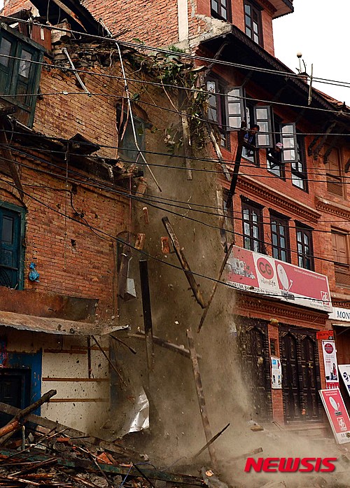 【카트만두(네팔)=뉴시스】조성봉 기자 = 네팔지진 다샛째인 29일 오전(현지시각) 네팔 카트만두 인근 박타푸르 뱌시에서 지진으로 위태로운 건물의 잔해들이 무너져 내리고 있다. 2015.04.29.
