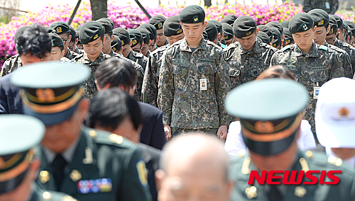 【파주=뉴시스】조수정 기자 = 개성 송악산 5.4 전투 육탄 10용사 제66주기 추도식이 엄수된 4일 오전 경기 파주시 통일공원에서 육군 1사단 장병들이 용사들의 넋을 기리며 묵념하고 있다.