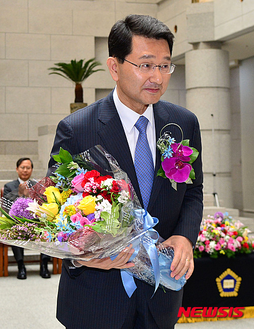 【서울=뉴시스】박동욱 기자 = 8일 오후 서울 서초구 대법원에서 열린 박상옥 대법관 취임식에서 박 대법관이 축하 꽃다발을 받은 뒤 인사하고 있다. 2015.05.08.