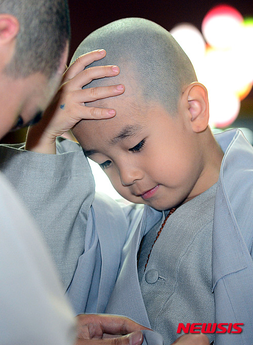 【부산=뉴시스】 하경민 기자= 12일 오전 부산 금정구 홍법사에서 열린 단기출사 동자승 삭발수계식에 참가한 동자승들이 삭발한 머리를 만지고 있다. 2015.05.12.