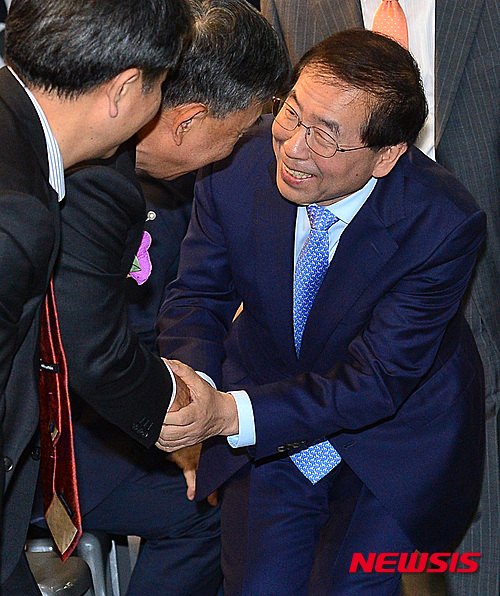 【서울=뉴시스】조종원 기자 = 12일 오전 서울시청 시민청에서 열린 '신문·뉴미디어 엑스포 2015'에서 박원순 서울시장이 참석자들과 인사를 나누고 있다. 2015.05.12.