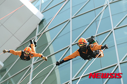 【대구=뉴시스】박문호 기자 = 13일 오후 대구 유통단지로 엑스코에서 열린 '제12회 국제소방안전박람회 성공 개최 지원 2015 소방 종합시범훈련'에서 인명구조에 성공한 구조대원들이 역레펠 탈출하고 있다.