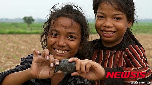 【서울=뉴시스】빈혈로 고생하는 사람들이 많은 캄보디아에서 철분 보충을 위해 쇠로 만든 물고기 모양의 쇳덩러리을 요리할 때 함께 넣어 철분을 보충하는 방법이 효과를 거두고 있다고 영국 BBC 방송이 보도했다. 캄보디아 여자아이들이 쇠로 만든 물고기를 들어보이고 있다. <사진 출처 : 英 BBC> 2015.5.18