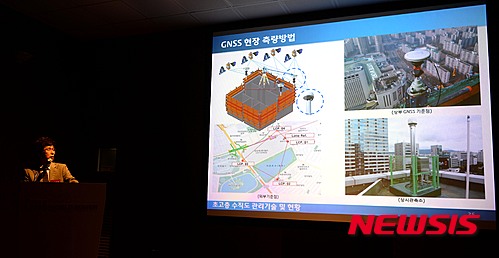 【서울=뉴시스】박영태 기자 = 26일 서울 송파구 제2롯데월드타워에서 진행된 ‘초고층의 측량 및 수직도 관리 시공기술 발표회’에서 박홍기 가천대학교 교수가 GNSS 등 롯데월드타워에 적용된 측량기술에 대해 발표하고 있다. 2015.05.26.